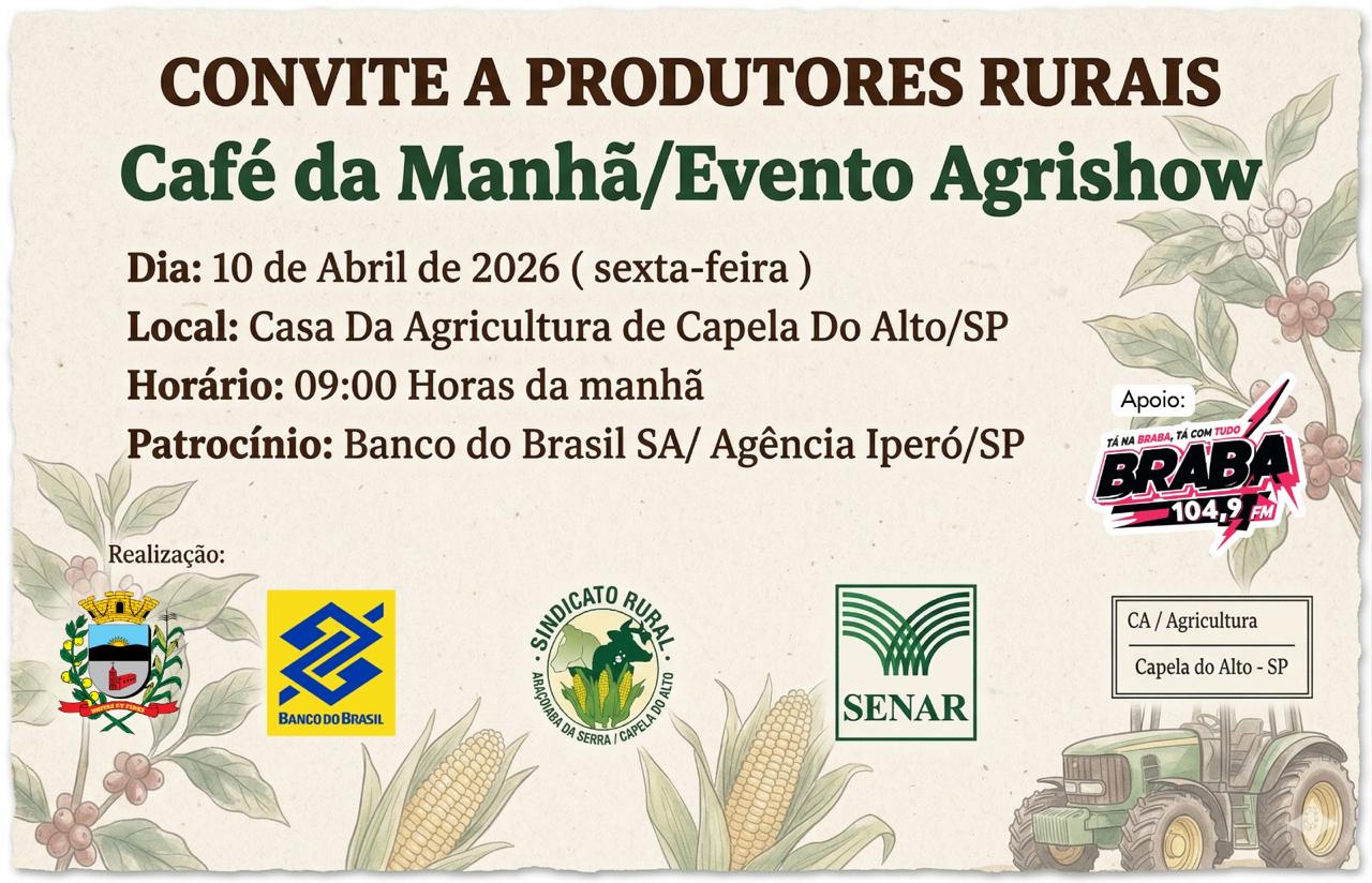 Você é nosso convidado especial para o Café da Manhã do evento Agrishow, um encontro dedicado aos produtores rurais da região. O evento será realizado no dia 10 de abril de 2026 (sexta-feira), às 09h00, na Casa da Agricultura de Capela do Alto/SP.