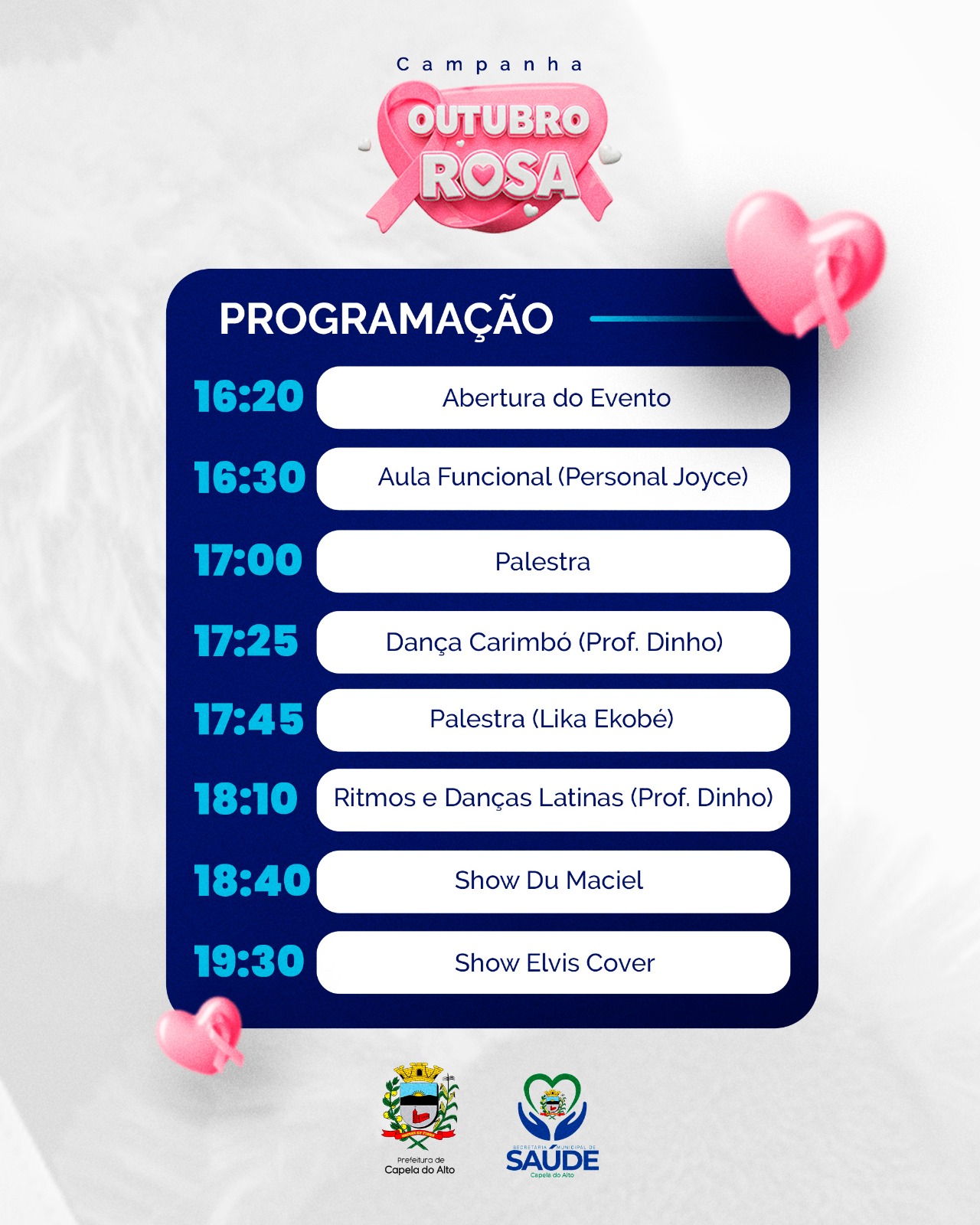 A Prefeitura de Capela do Alto, em parceria com a Câmara Municipal, convida toda a população para participar de uma programação especial dedicada ao Outubro Rosa, campanha mundial de conscientização e prevenção ao câncer de mama.